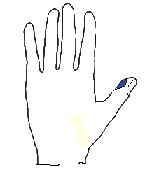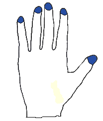 2.Jobb kézfej: Alsó, felső állkapocs, fogak, fogidegek, nyálmirigyek. |